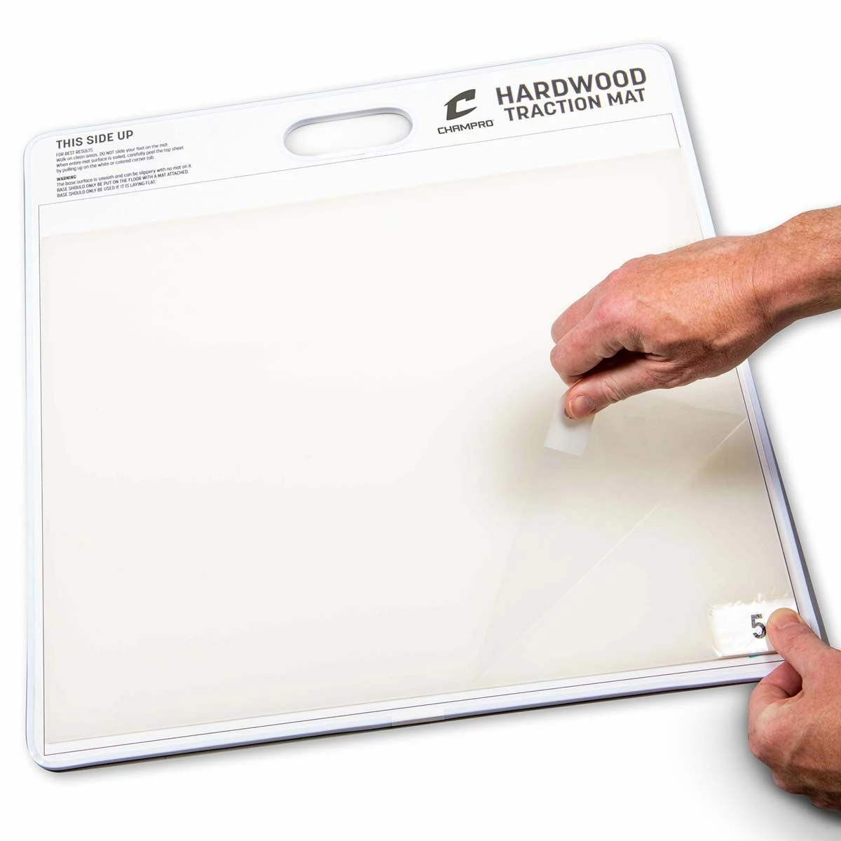 The Champro hardwood traction mat includes 60 traction sheets that provide an improved shoe grip on any gym floor. The traction sheets also help to remove dust, dirt and wax build-up from athletic shoe soles with one quick action. This traction mat kit eliminates the hand wiping of shoe soles for better traction and less slippage. These sheets are great for basketball teams, volleyball teams and physical education classes.