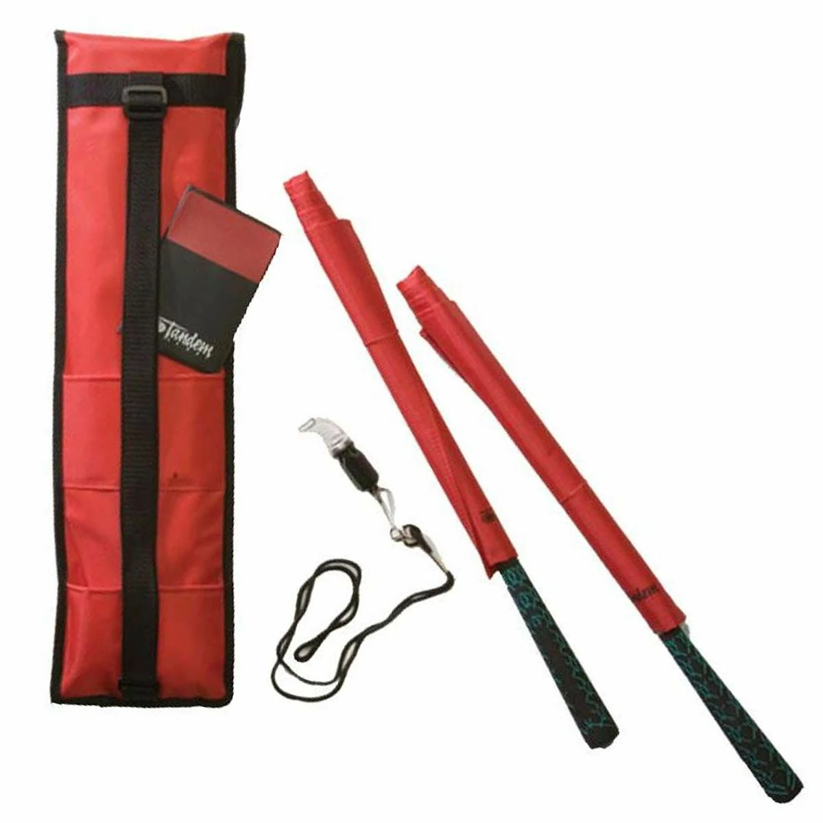 The Tandem volleyball officials’ elite starter kit is a must-have for every volleyball official. This set includes all the volleyball officiating necessities in one convenient kit. The kit is complete with penalty cards, linesman flags with golf grips, a black whistle with lanyard, and a convenient carrying case.ย