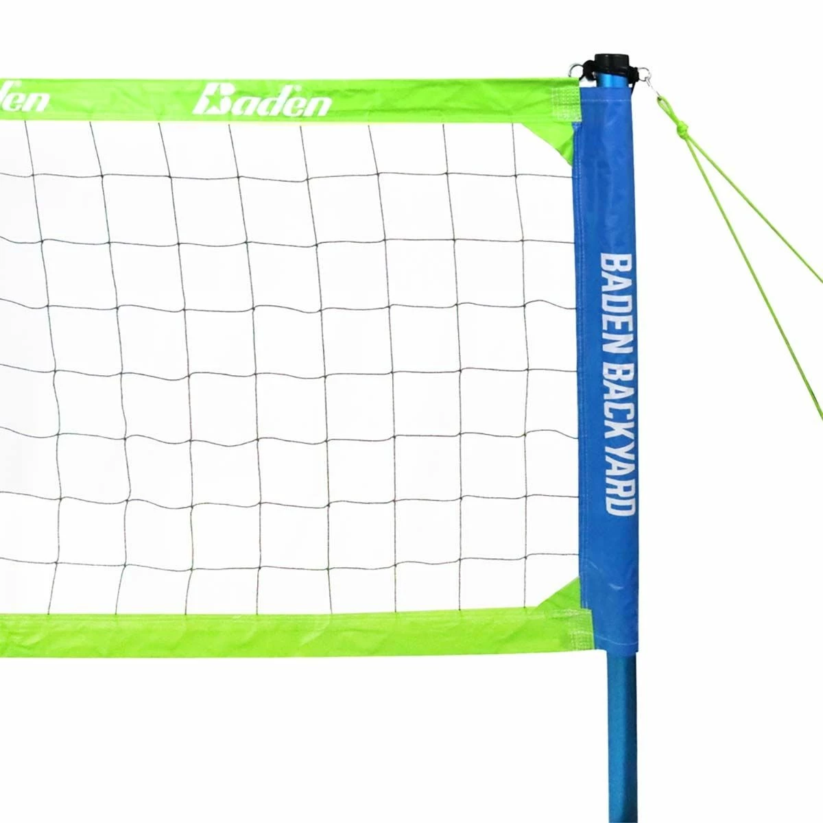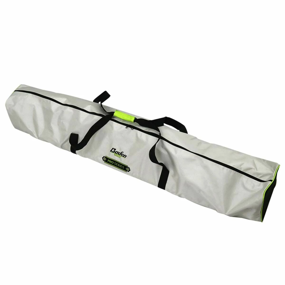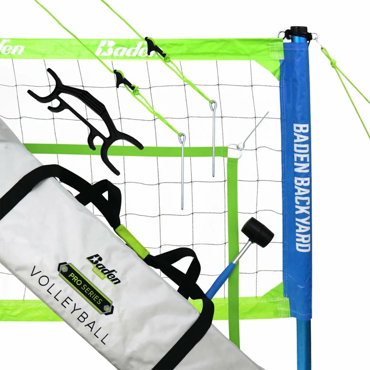 The Baden Pro Series Volleyball Set is the perfect tournament-level volleyball set to use in a park or in your own backyard. The set includes 2-piece heavy duty adjustable aluminum poles, a regulation 32โ x 3โ nylon mesh net with waterproof tape, a set of weatherproof high-visibility green boundary lines pre-measured to 30โ x 60โ, a rubber mallet, a boundary spool, guywire, steel stakes, and a durable weather-resistant carry bag with zipper. The push-button adjustable pole can be set to multiple heights: 8โ for men, 7โ 8โ for co-ed, 7โ 4โ for women.The 2-piece telescoping poles allow for easy setup and take down, simply roll up your net on the poles after use. Mark the court with an over 1-3/16โ wide high-visibility boundary pre-measured to 30โ x 60โ and made of green nylon webbing. A double stitched red line marks the center of the court. The boundary line stores easily on the included plastic spool. includes 5/16โ double guywire with plastic adjusters to tighten and maintain tension during play. 10โ steel stakes secure the net to the ground and keep it tight throughout play. There’s an included heavy-duty 12oz. rubber mallet with steel handle to hammer the net stakes into the ground. The 1680 denier polyester carry bag has extra space inside to hold up to 5 volleyballs. This Pro Series set is designed for outdoor use on grass and is backed by a lifetime warranty.