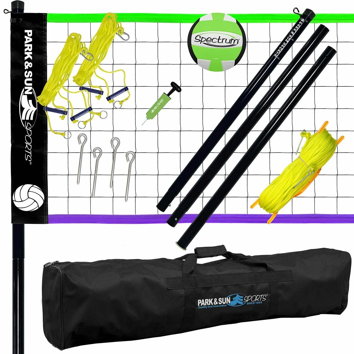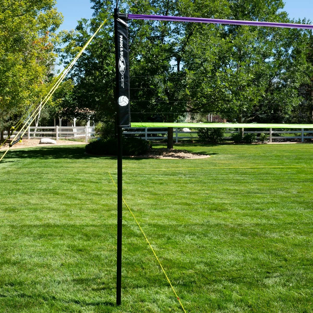 The Park & Sun Spiker Sport SL is a complete volleyball net system that comes with everything needed for a fun & dynamic outdoor volleyball game. This set includes a regulation size 3โ x 32โ net with 5โ net sleeve, 1.5โ net tapes with reinforced corners, 1-1/2โ 3-piece steel poles with easy to use push-button locks, an 18 panel Soft Touch volleyball, guylines, a pre-measured boundary for standard court dimensions of 60โ L x 30โ W, a volleyball hand pump, and a full size carrying bag with zipper and carrying straps. This net system features a flip-able net design that allows you to choose between phantasmic purple or photon green for the net tape color. The net height is easily adjusted by sliding the net to the desired playing height and then locking it in place with net clips.