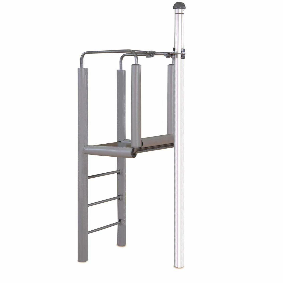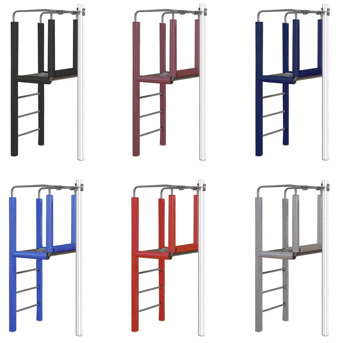 The Bison NCAA beach volleyball official’s platform with padding is perfect for sand courts as it features special sand skids avoiding sinking into the sand, allowing for easy transportation. It features an integrated ratchet style clamp device that attaches the platform to pole quickly and securely. The powder coated 1″ heavy wall tube construction provides great durability.Β This platform adjusts in 1″ increments and can be adjusted from 47″ to 53″ height for officials and play at all net heights. For the player’sΒ protection, it has a 1″ thick padding that comes in a variety of colors customized to your team.