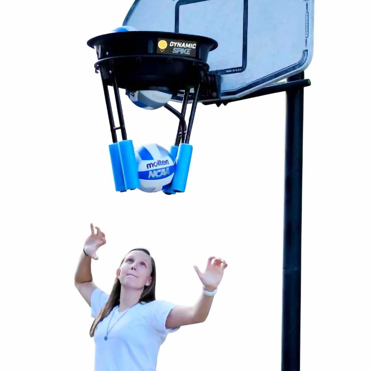 The DynamicSpike volleyball trainer is a lightweight, portable hitting trainer that helps players of all ages improve their volleyball skills and build confidence spiking the ball. Holding 3 volleyballs at a time, the trainer has an auto-delivery system that automatically reloads a ball into position once the previous ball has been hit. By holding the ball in a static position, the trainer is ideal for practicing footwork, timing, arm swing, and overall ball contact. This is the perfect volleyball training aid to improve a player’s digs, passes and sets. The trainer can be placed in the rim of any standard basketball hoop and allows for solo training or with teammates. Designed for indoor and outdoor use, the DynamicSpike trainer is made with safe and durable plastics including Seaboard HDPE, making it usable in any weather condition.