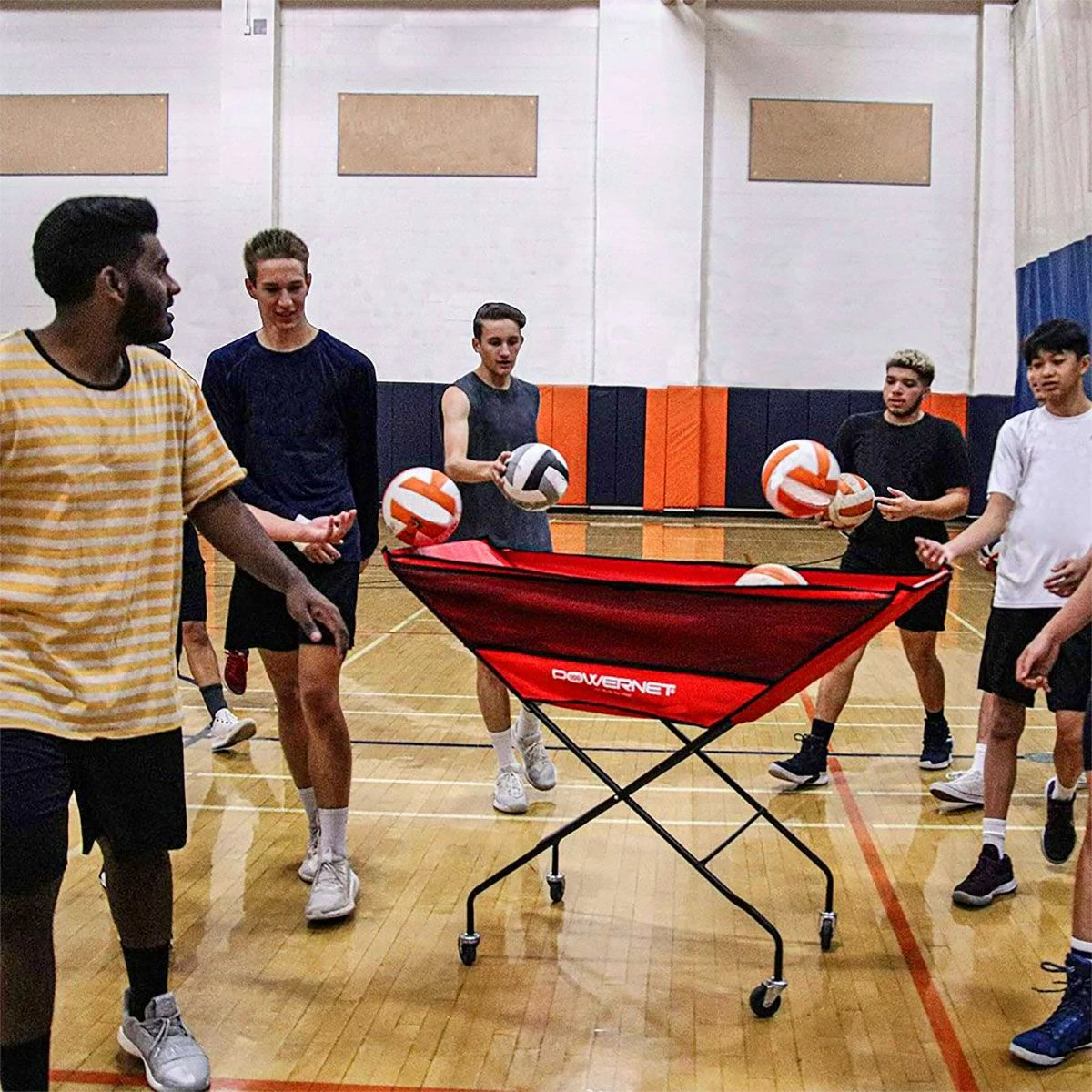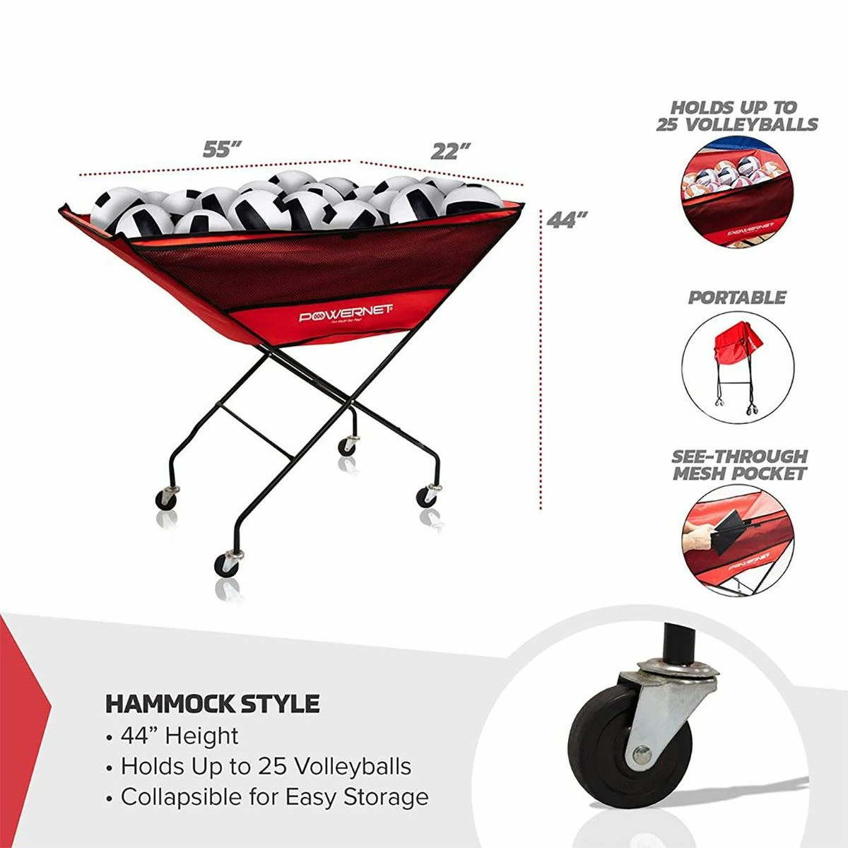The wheeled volleyball cart by Powernet is collapsible and perfect for solo or team volleyball training. The hammock style basket can hold up to 25 volleyballs, helping training sessions run smoother rather than wasting time collecting mishits. At 44โ tall, this cart stands at the ideal height for picking up volleyballs and can move freely around the gym with its 4 caster wheels. An extra large mesh side pocket holds knee pads, notebooks, first aid kits, or any necessary equipment.