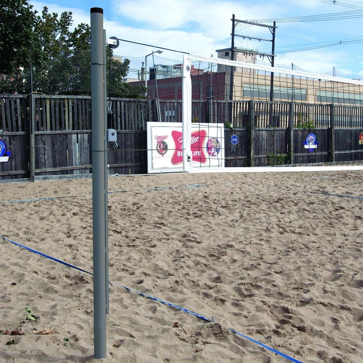 Get your game on at the beach at the same level as on the hardwood court with the Bison Match Point Outdoor Sand Volleyball Uprights & Net set. This system includes durable 3-1/2″ aluminum posts that are powder coated for rust resistance and a competition level net. Adjust the net height by a single locking knob on each movable net attachment bar. Easily tighten the net via a worm gear style winch for the top net rope and ratcheting style tensioners for the bottom rope and net side tapes. The net is constructed of black polypropylene, 3mm knotless woven webbing that is built to last in the toughest conditions. This system is backed by a 5-year limited warranty on the standards and a 1-year limited warranty on net.