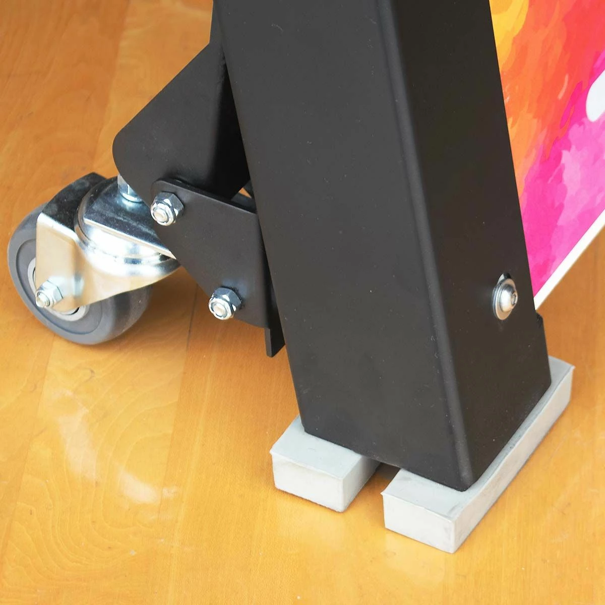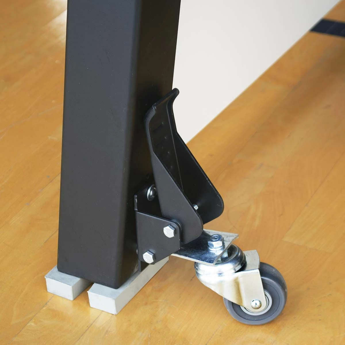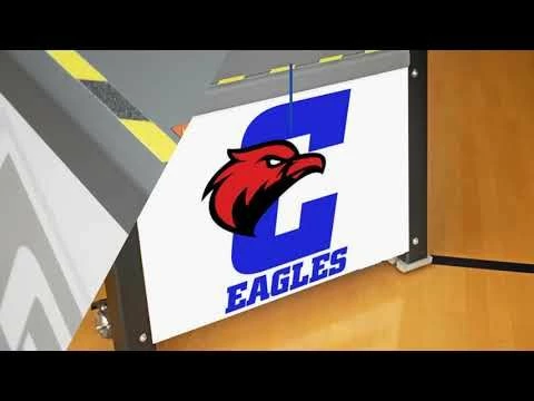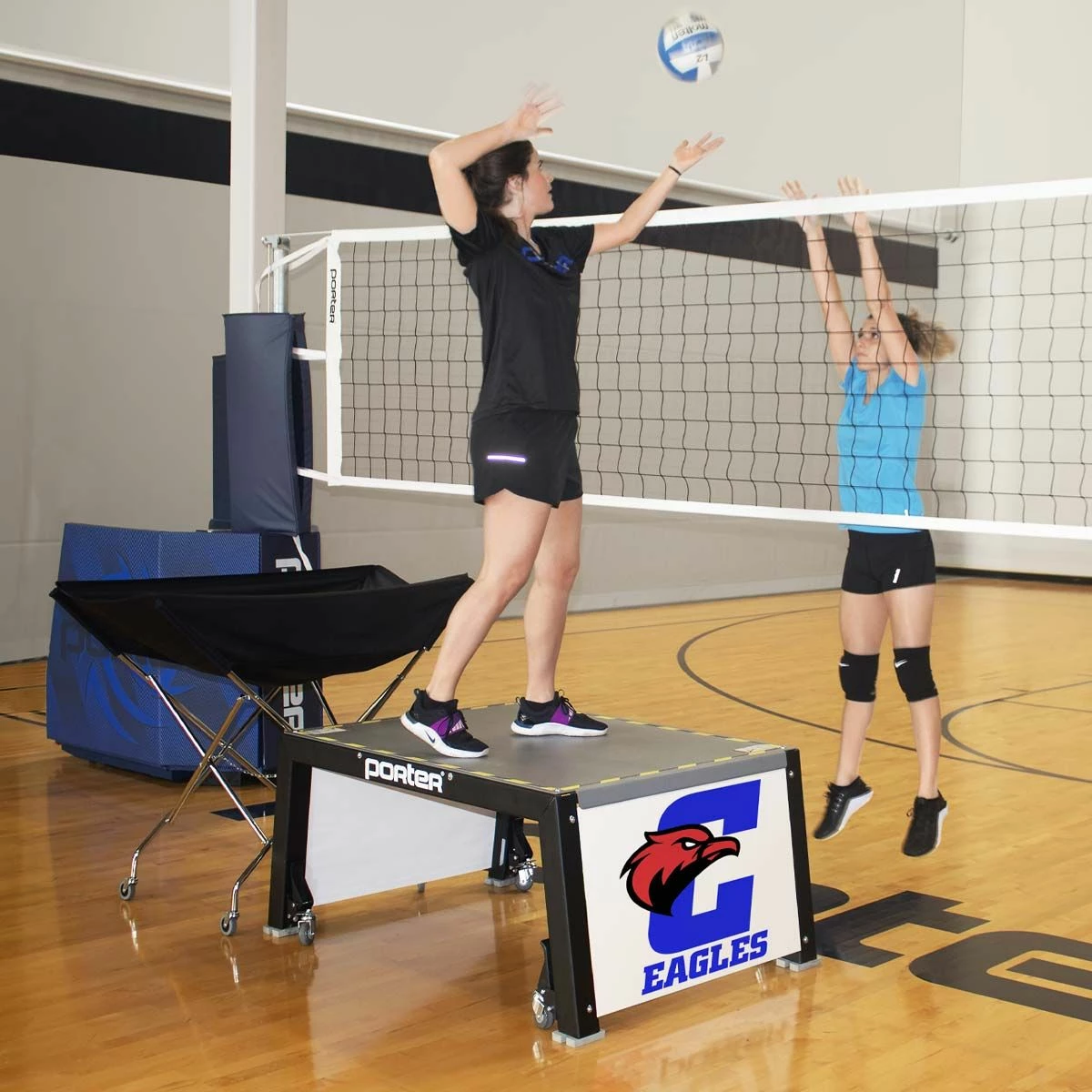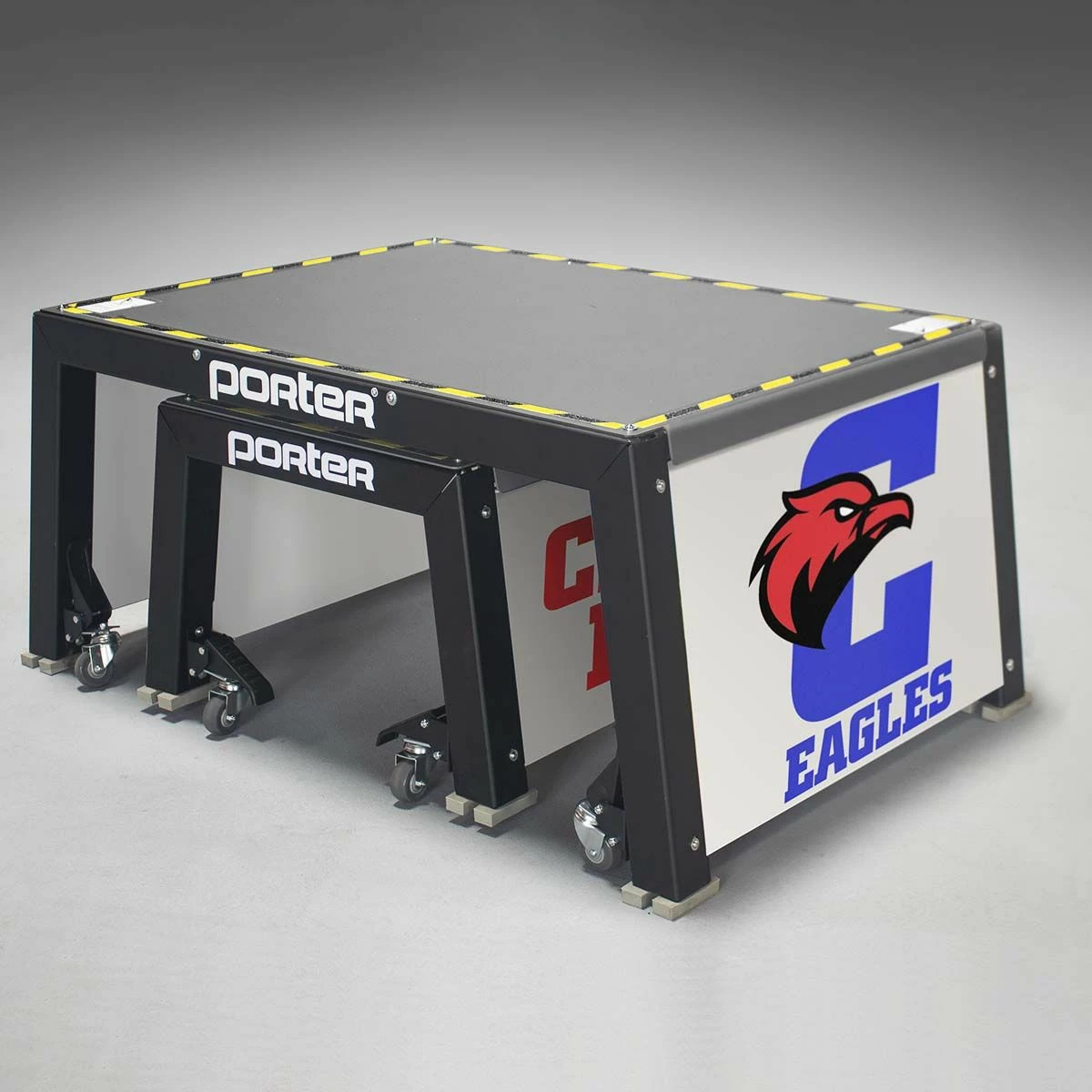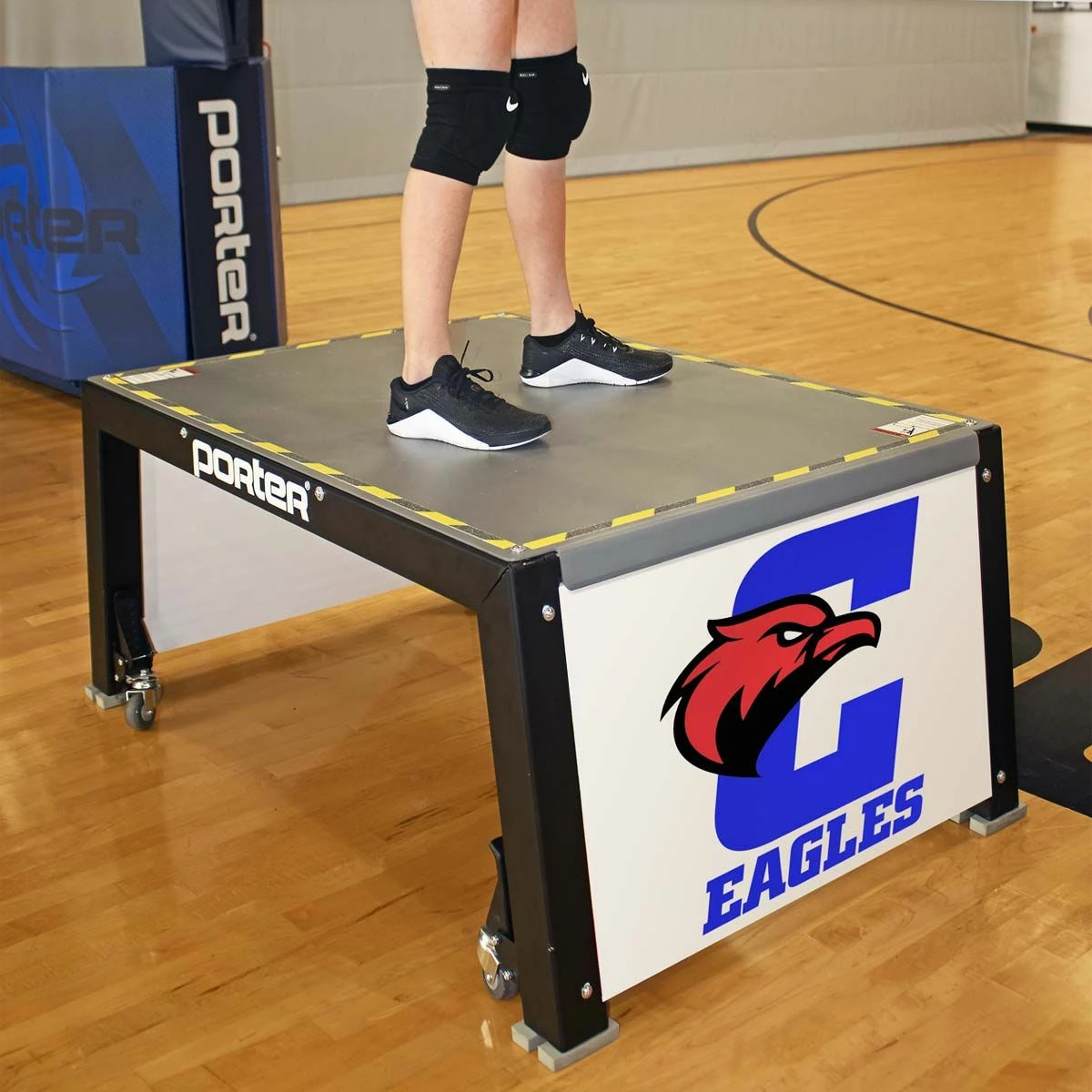 Elevate your training with the Porter volleyball coaches stand. This coach platform allows coaches to run drills from above the net for a more effective training experience. This portable coaches stand can be easily positioned anywhere along the net thanks to four built-in wheel casters. Easy to operate foot levers lock the coaches stand in place while providing quick stop-and-go mobility during practice. Rubber feet prevent any gym floor scratches. The all steel frame provides better stability and safety compared to traditional wood platforms. Add your team or school logo on the graphic side panels at no additional cost.