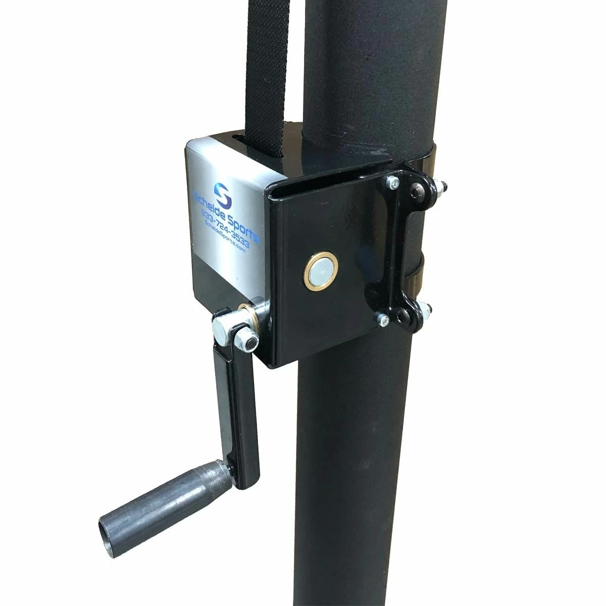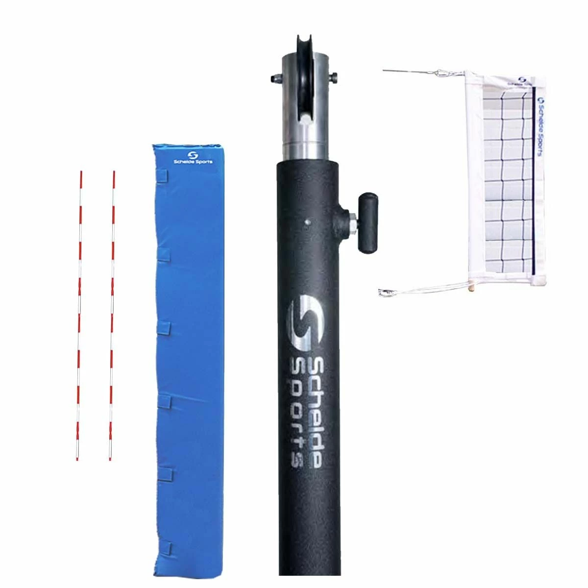 The Schelde A3 PLUS volleyball net system features 3-inch diameter reinforced aluminum uprights that won’t flex under full net tension. The uprights weigh approximately 30 pounds each and are light enough for easy set up and take down. These 3″ diameter uprights will fit directly into your 3-inch diameter floor sleeves, however this system includes adapters that will transform a 3.5 inch floor sleeves down to a 3-inch diameter sleeves. The A3 PLUS has telescoping uprights that will adjust to a fraction of an inch to accommodate men’s, women’s, junior men’s, and junior women’s net heights. The 4-point net attachment system allows for easy set up and offers great net tension. There’s a built-in spring mechanism safety feature that will prevent the top upright from crashing down if lose grip while changing the net. The A3 PLUS is equipped with a durable pulley wheel at the top that will accommodate a cord style net. The easy to use worm gear winch offers excellent net tension. This lightweight system has very few moving parts, is long lasting, and requires minimal maintenance. The A3 PLUS net system is a great value and one that we highly recommend for all levels of play.