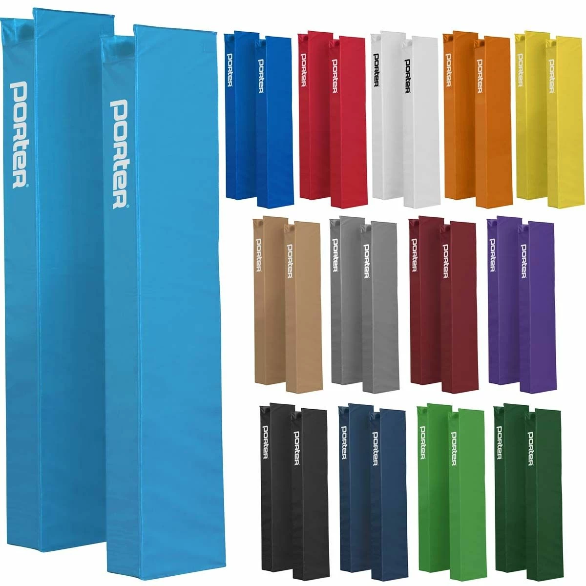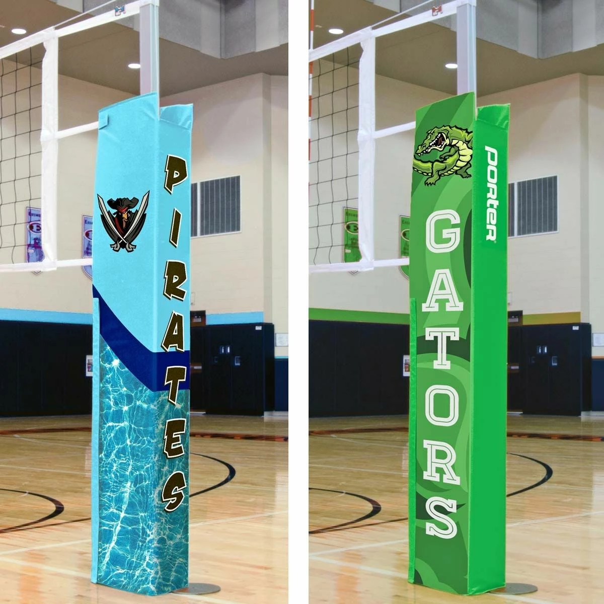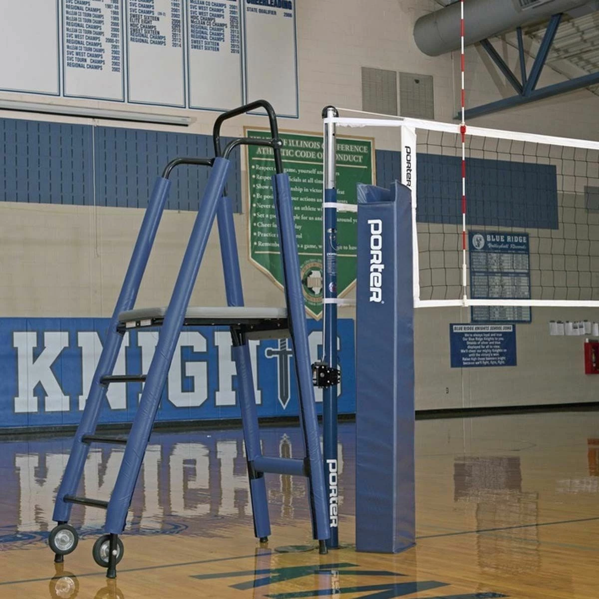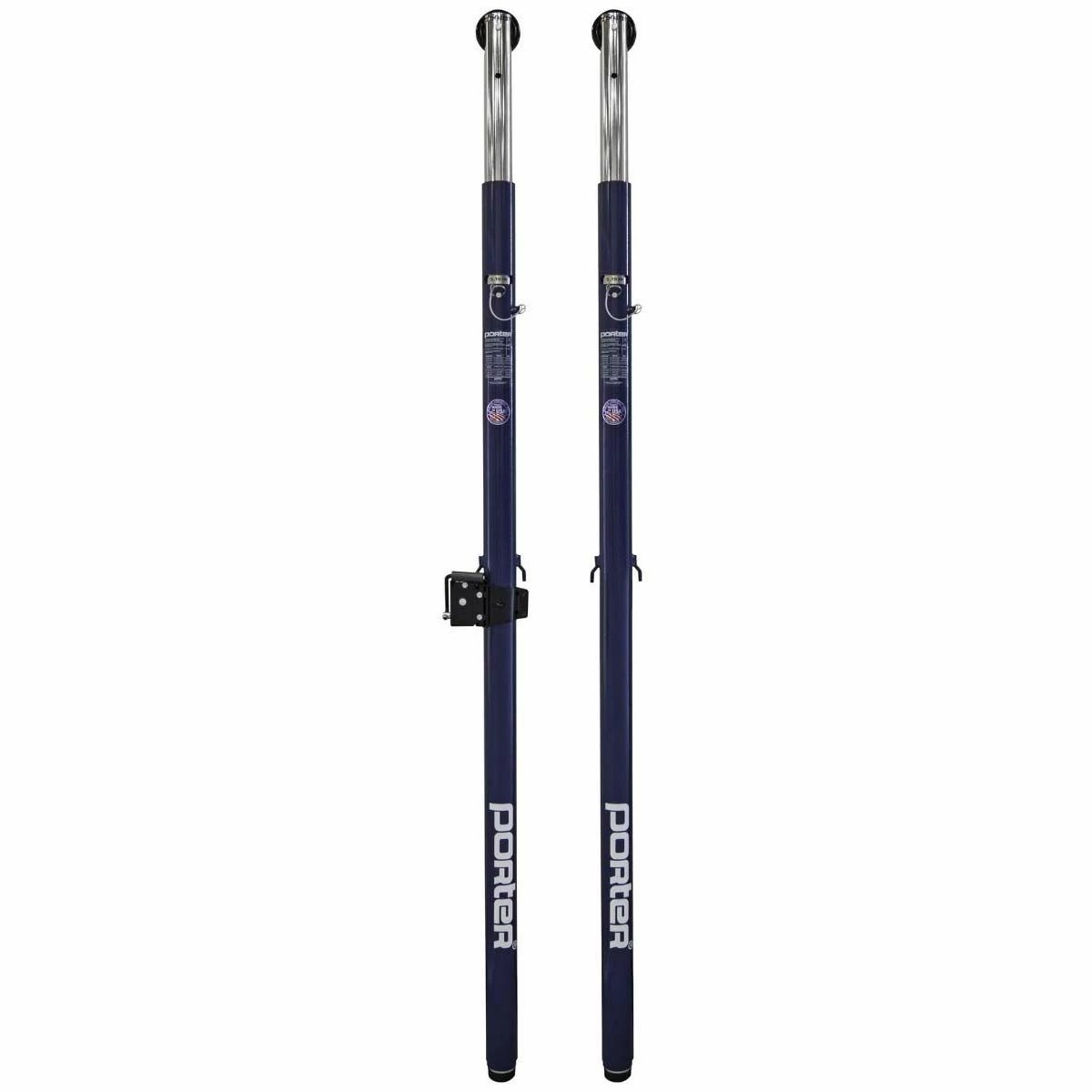 The Powr-Steel international volleyball net package from Porter is built to last with an extremely durable steel frame. This volleyball package includes a free-standing judge stand with stand padding. The 3″ OD steel uprights are sleek, strong, and weigh under 50lbs each. The pair of uprights includes one winch post and one end post. The uprights feature a telescoping design with a high strength pull pin for easy height adjustment to meet all USAV, NCAA and NFHS requirements for competition. A powder coated finish on the bottom part of the upright provides corrosion resistance. A self-locking worm drive prevents net snap back and loss of tension. The bottom of each upright is equipped with an adjustable rubber foot that protects finished floors when moving the standard. This rubber footing can be height adjusted to accommodate ground sleeves that were installed too deeply. The system’s steel infrastructure is built to last with an extremely durable frame and is backed with a lifetime limited warranty. The included upright padding is offered in 14 different colors and can be customized with your team or school logo.