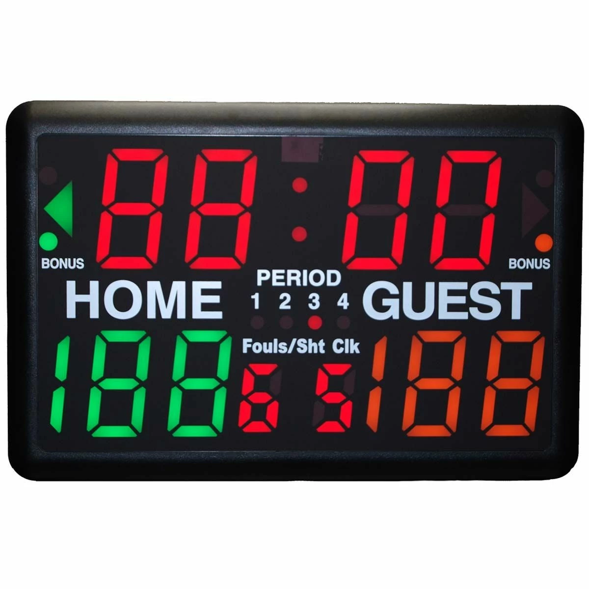 The Trigon multi-sport tabletop scoreboard makes keeping score simple and easy! This battery operated tabletop scoreboard has a rechargeable battery that lasts up to 6 hours when fully charged. This portable scoreboard measures 24″W x 16″H x 10″D and can be used in basketball, volleyball and wrestling. The multi-sport tabletop scoreboard features a clock, stopwatch and timer program with alarm, and bonus, period and foul indicators. Plus, a wireless remote is included to make score keeping even easier. Carry the lightweight tabletop scoreboard to the court with the built-in carry handle. A stand is available for purchase separately (see A91-189 below).